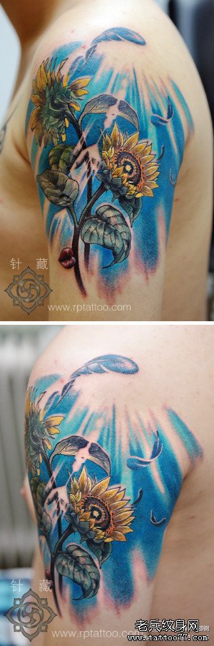手臂漂亮潮流的彩色向日葵花纹身图案