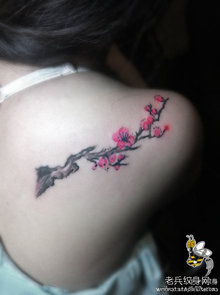 女生肩背潮流时尚的梅花纹身图案