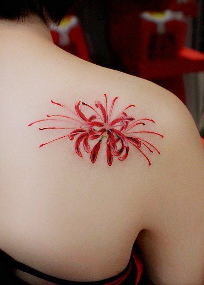 女生肩背潮流好看的彩色彼岸花纹身图案