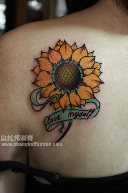 女生后肩背时尚经典的向日葵花纹身图案