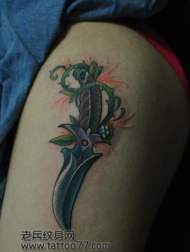 女孩子腿部彩色匕首纹身图案