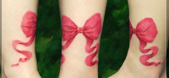 女生腿部艳丽的彩色蝴蝶结纹身图案