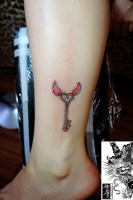 女生腿部小巧的钥匙纹身图案