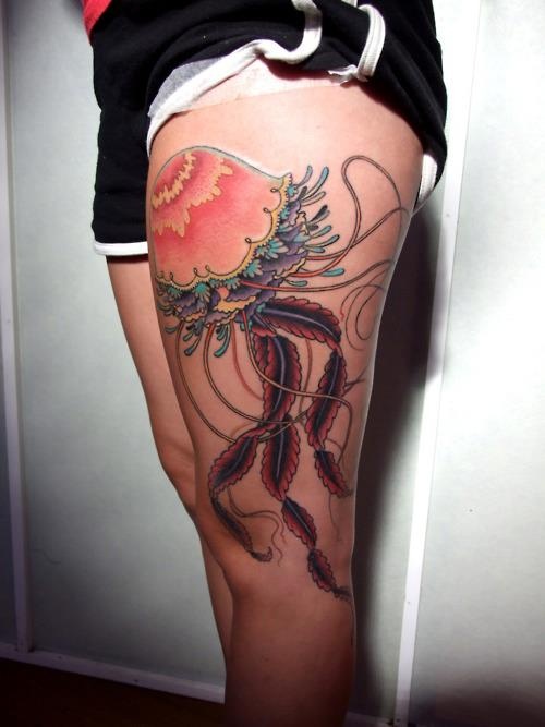 女生腿部漂亮的彩色水母纹身图案