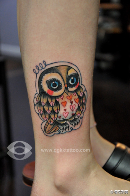 女生腿部可爱的猫头鹰纹身图案