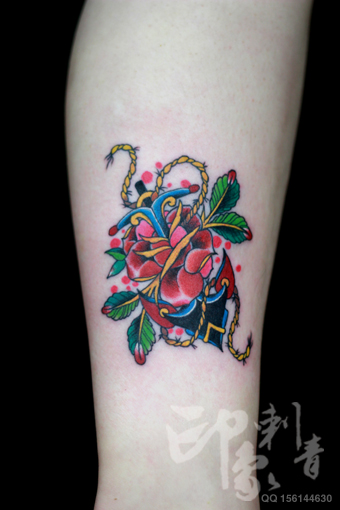 女生腿部时尚漂亮的玫瑰花与船锚纹身图案