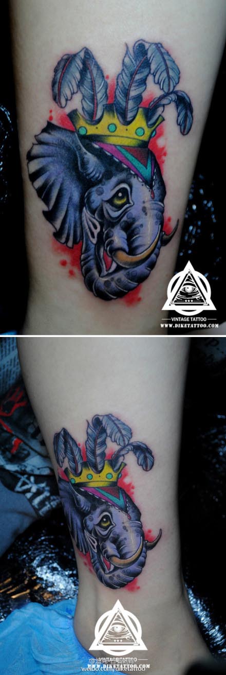 腿部时尚好看的彩色大象纹身图案