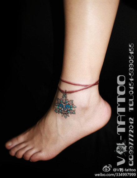 女生脚腕处精美时尚的骷髅脚链纹身图案