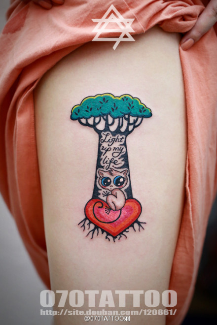 女生腿部潮流时尚的小树与猫咪纹身图案