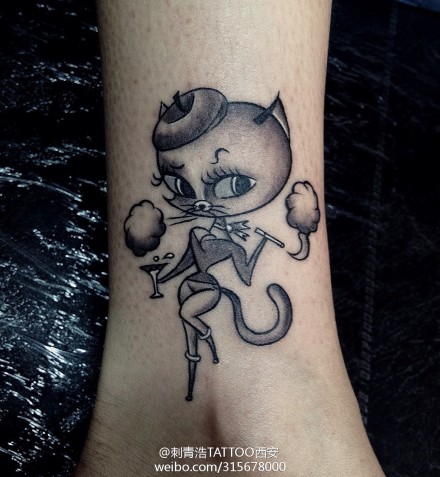 女生腿部一款可爱的抽烟的猫咪纹身图案