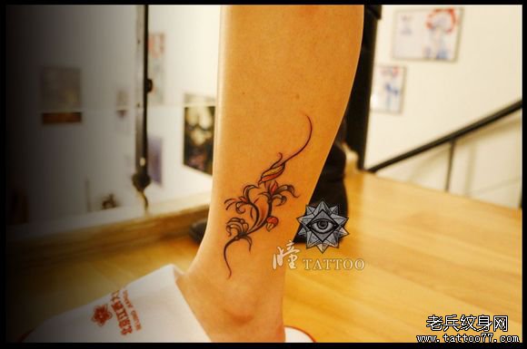 腿部潮流唯美的花卉藤蔓纹身图案