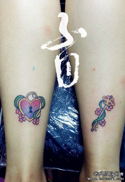 女生腿部精美潮流的爱心锁与钥匙纹身图案