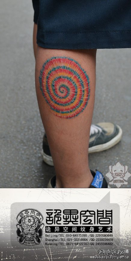 男生腿部超酷的一款彩色迷幻的图腾纹身图案