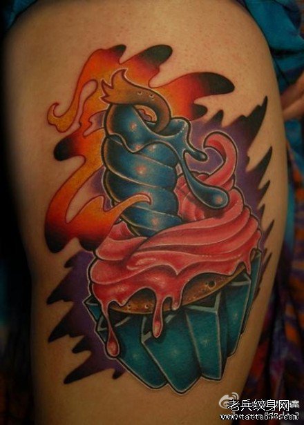 腿部经典潮流的一款蜡烛与冰激凌纹身图案