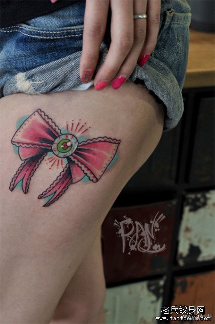 女生大腿漂亮时尚的蝴蝶结纹身图案