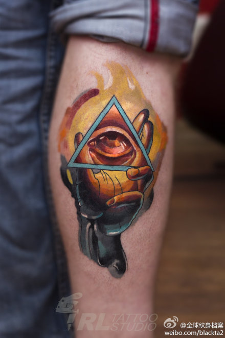 腿部时尚经典的一款彩色全视之眼纹身图案