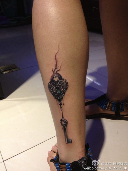 女生腿部潮流时尚的爱心锁与钥匙纹身图案