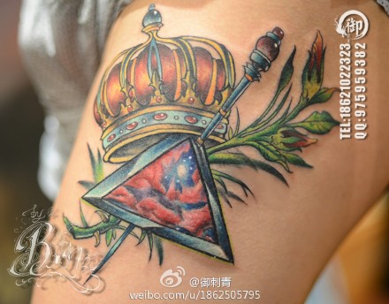 美女腿部精美的皇冠权杖星空纹身图案