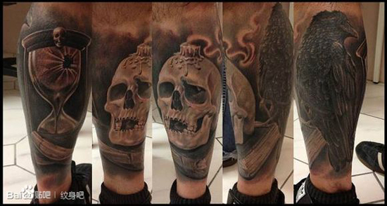 腿部时尚很酷的乌鸦骷髅纹身图案