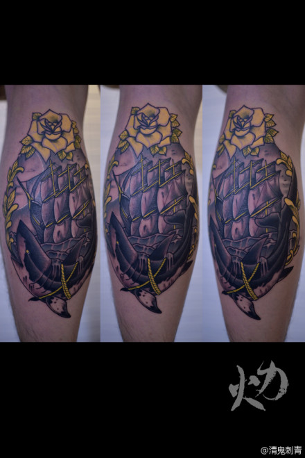 腿部潮流时尚的一款鲨鱼与帆船纹身图案