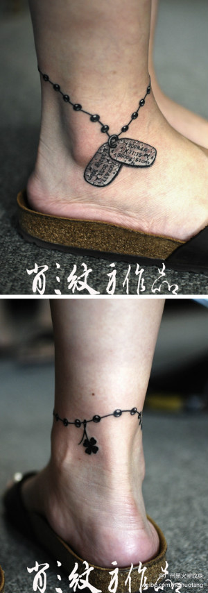 男生腿部经典的一款军牌脚链纹身图案