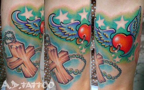 腿部时尚潮流的爱心翅膀十字架纹身图案
