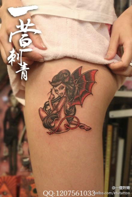 女生腿部时尚经典的小恶魔纹身图案