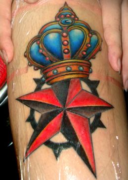 腿部纹身图案:腿部彩色五芒星皇冠纹身图案