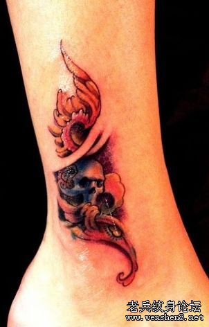 一款腿部彩色骷髅藤蔓纹身图案纹身图片