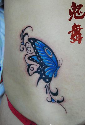 女孩子腹部艳丽的彩色蝴蝶纹身图案