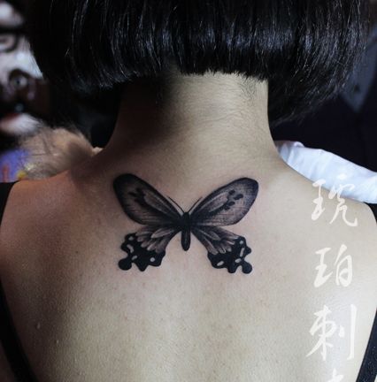 女孩子背部时尚精美的黑白蝴蝶纹身图案