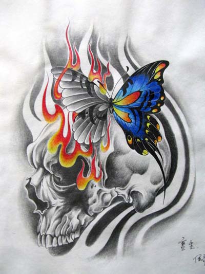 一款经典的蝴蝶骷髅纹身图案,寓意:重生!!!