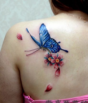 美女肩背漂亮的彩色蝴蝶与樱花纹身图案
