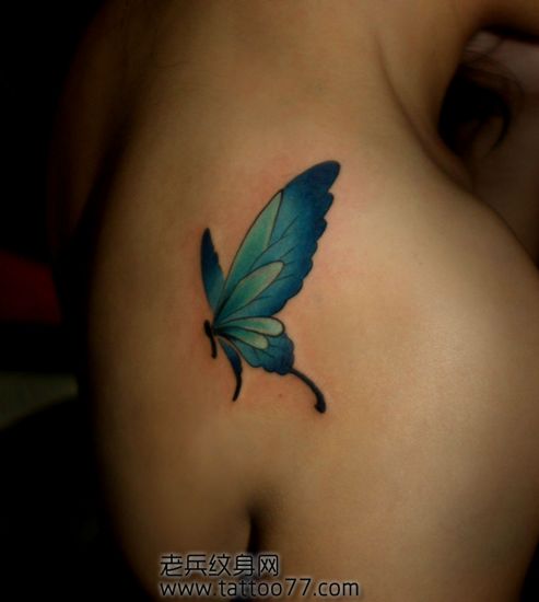 肩背漂亮的彩色蝴蝶纹身图案