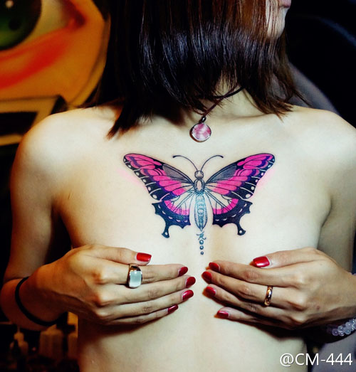 美女胸前好看的彩色蝴蝶纹身图案