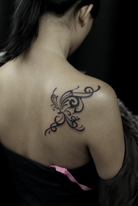 女生肩背流行好看的图腾蝴蝶纹身图案