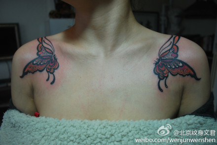 美女肩膀处时尚唯美的蝴蝶纹身图案