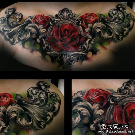 女生前胸唯美潮流的彩色玫瑰花纹身图案