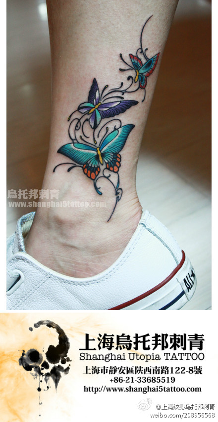 女生腿部唯美潮流的彩色蝴蝶纹身图案