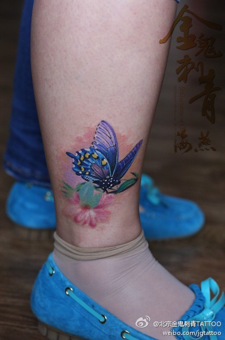 女生腿部潮流时尚的彩色蝴蝶纹身图案