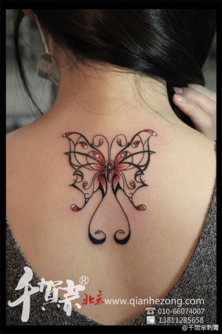 女生后背时尚精美的图腾蝴蝶纹身图案