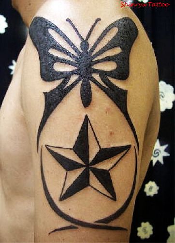 专业刺青店:大臂图腾蝴蝶五角星纹身图案图片