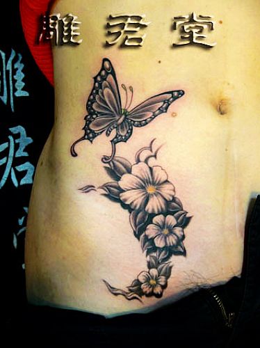 湖北恩施专业文身店:腹部蝴蝶花纹身图案图片