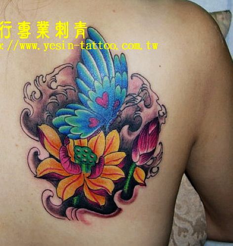 湖北咸宁文身店:一款适合男人的蝴蝶莲花纹身图案图片
