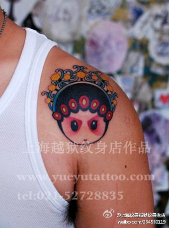 男生肩膀处卡哇伊的卡通花旦纹身图案