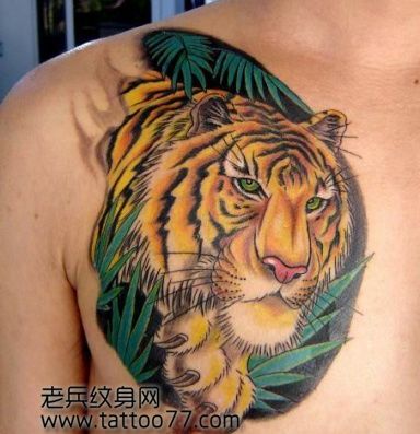 胸部好看的彩色虎头纹身图案