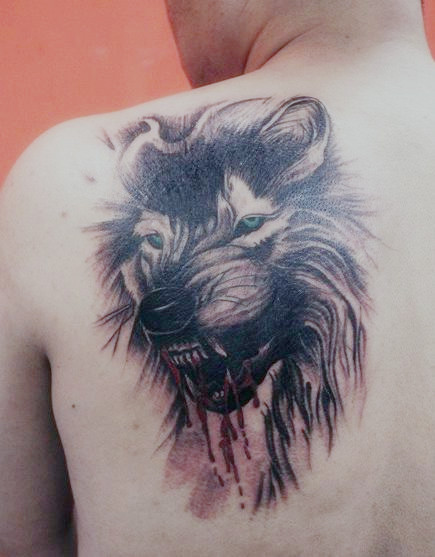 男人肩背帅气的滴血狼头纹身图案