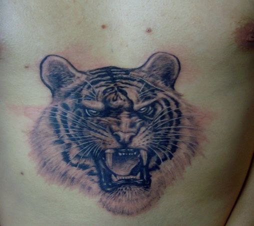 胸部凶悍的一款黑白虎头纹身图案