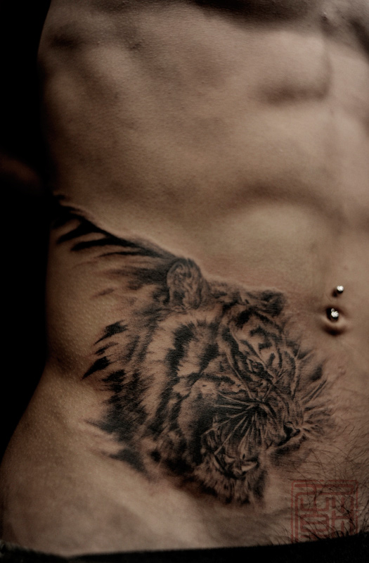 男人腹部经典霸气的虎头纹身图案