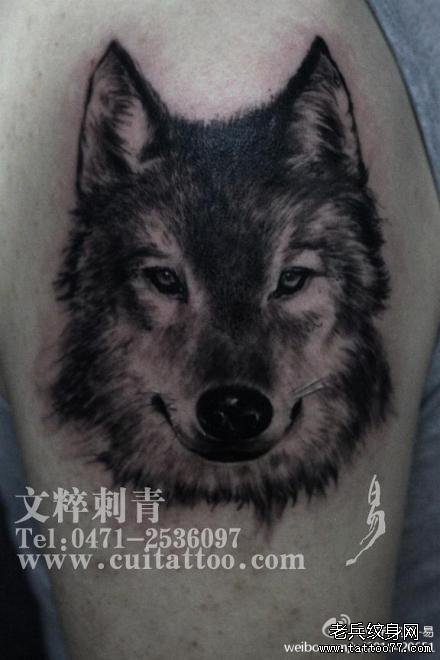 手臂潮流时尚的一款黑灰狼头纹身图案